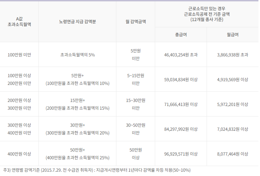 직장을 다니거나 경제활동을 해 소득이 있는 경우 국민연금 수령 시 감액 기준 이상의 소득이라면 국민연금액이 감액됩니다.