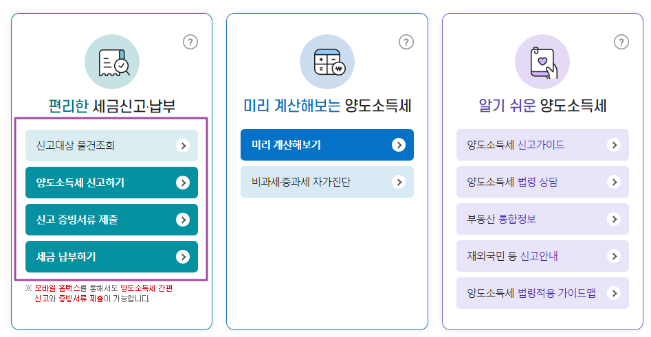 홈택스에서 양도소득세 신고방법으로는 '양도소득세 ' 페이지에서 양도소득세 신고하기 메뉴에서 신고 및 납부할 수 있습니다.