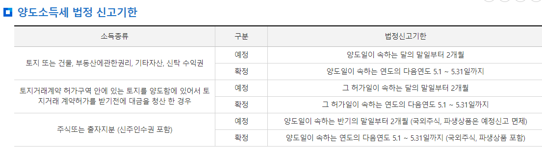 만약 양도소득세 신고기간 안에 신고를 하지 못할 경우 양도일이 속한 연도의 다음 연도 5월 한 달간 확정신고 기간을 이용하시면 됩니다.