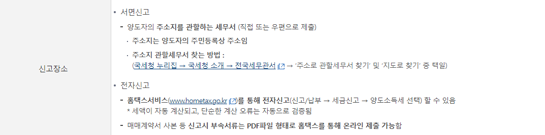 양도소득세 신고는 양도자의 주소지 관할하는 세무서에 직접 방문하거나, 우편으로 제출 가능하지만 간편하게 인터넷 국세청 홈택스에서 전자 신고 할 수 있습니다.