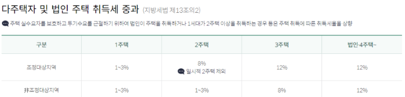 3주택부터는 조정대상지역 12% 취득세율, 비조정대상지역에서는 8%의 취득세율이 적용됩니다.