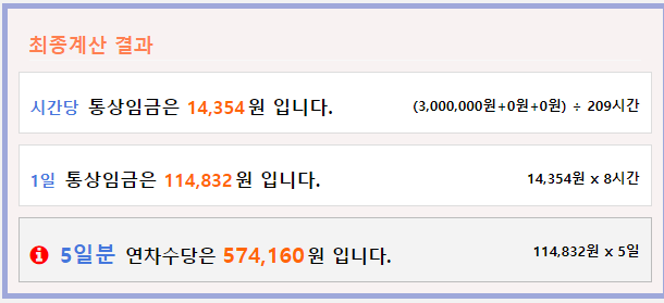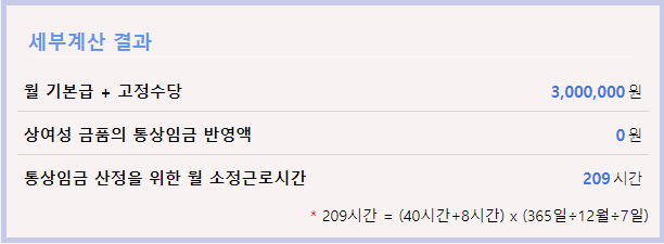 (3,000,000원 ) ÷ 209시간 = 시간당 통상임금 14,354원이 됩니다.