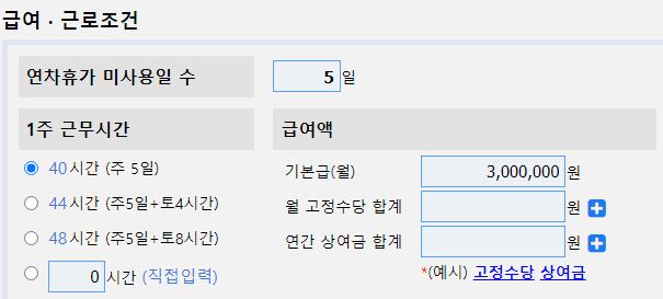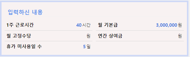 예를 들어 1주 근로시간 40시간, 남은 연차 휴가일수 5일, 기본금 300만 원으로 연차수당을 계산해 보겠습니다.
