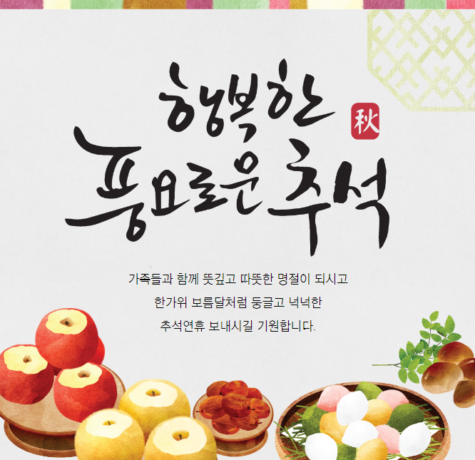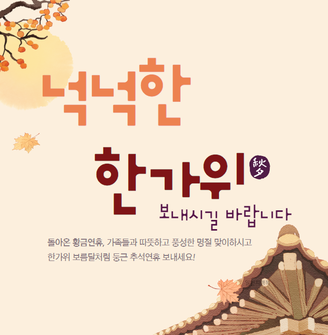 ✅ 추석을 맞아 감사의 인사를 드리며 보름달처럼 밝고 환한 웃음 가득한 연휴를 보내길 바랍니다. 넉넉하고 풍요로운 명절연휴 보내세요.