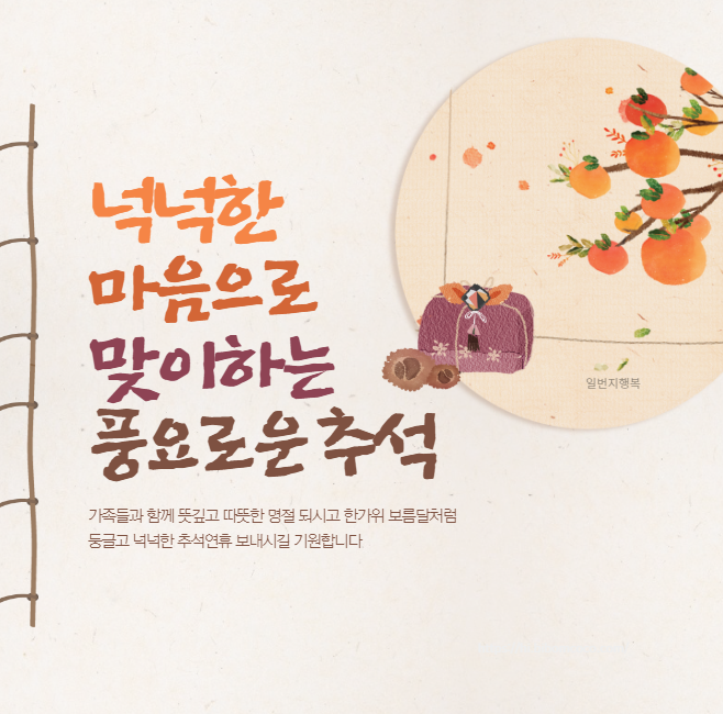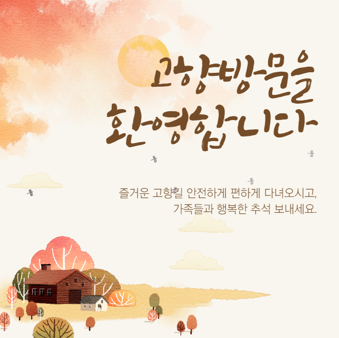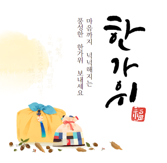✅ 알밤이 터지는 소리, 누렇게 익어가는 밭, 한 해의 풍요로움을 만끽할 수 있는 한가위가 찾아왔습니다. 추석 연휴 동안 맛있는 음식도 많이 드시고, 가족과 행복한 시간 보내시기 바랍니다.