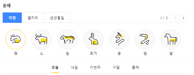 다음에서 제공하고 있는 토정비결 운세입니다. 띠별, 별자리, 생년월일 운세를 제공하고 있습니다. 생년월일을 입력하면 오늘, 내일, 이달, 올해의 운세를 전체적으로 볼 수 있습니다.