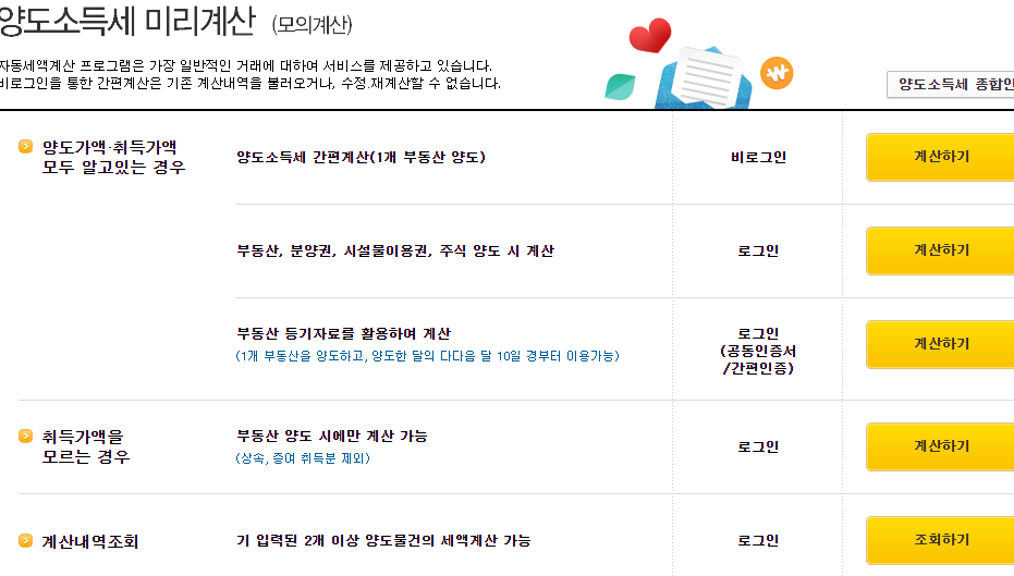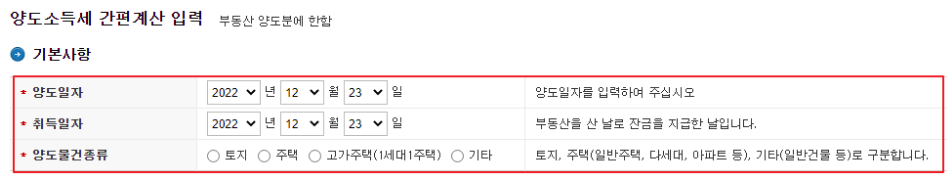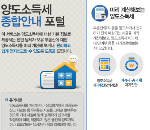 그래서 정확한 계산을 위해서는 양도소득세 자동계산을 이용해야 합니다. 국세청 홈택스에 제공하는 양도소득세 자동계산을 이용하면 최대한 정확한 양도소득세를 계산할 수 있습니다.