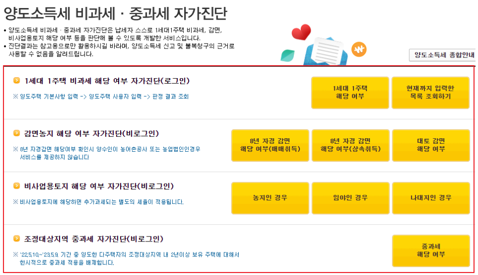 양도소득세 비과세 중과세 자가진단을 통해서 양도소득세 비과세 요건 해당 여부를 확인할 수 있습니다. 워낙에 양도소득세 관련 세법이 수시로 변경이 되기 때문에 직접 중과세 대상 여부를 확인하는 게 쉽지 않습니다.