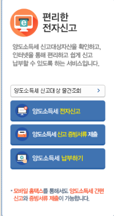 양도소득세 신고는 양도자의 주소지 관할하는 세무서에 직접 방문하거나, 우편으로 제출가능하지만 간편하게 인터넷 국세청 홈택스에서 신고할 수 있으니 이용해 보시기 바랍니다.