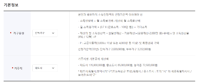 단독가구 소득인정액은 202만 원 이하, 부부가구 소득인정액은 323만 원 이하입니다.