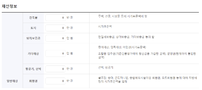 이후 소득과 재산 정보를 입력합니다. 소득에는 근로소득, 사업소득, 재산소득등을 포함하며 재산에는 건축물, 회원권, 자동차, 금융재산 등이 포함됩니다.