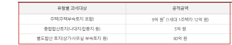 주택 및 토지를 유형별로 구분하여 각 개인별로 합산한 결과 그 공시가격의 합계액이 각 유형별로 적용되는 공제금액을 초과한 경우 그 초과분에 대해서 과세됩니다.