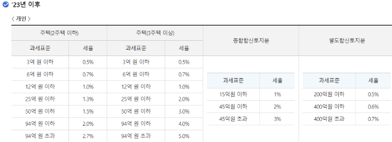 종부세 2 주택 이하 세율은 0.5~2.7입니다. 3 주택 이상은 3억 원 이하 0.5% 세율 ~ 94억 초과 5.0% 종부세율이 적용됩니다.