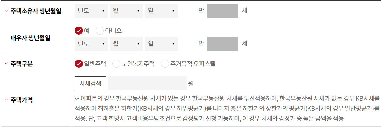 홈페이지 화면에서 '예상연금조회'를 선택한 후 주택소유자 생년월일, 주택구분, 주택가격 등 해당하는 사항을 입력합니다. 정확한 수령액 계산을 위해서 최대한 정확하게 입력을 하는 것이 좋습니다.