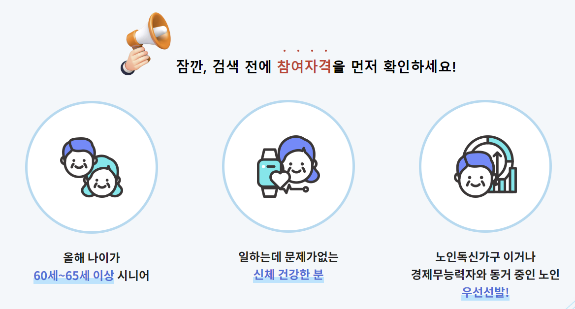 만 65세 이상 또는 60세 이상의 노인이 대상입니다. 보육시설 지원, 청소년 시설 지원, 장애인 서비스 지원, 교육보조, 노인 돌봄 서비스 등의 사회적 업무를 수행합니다.