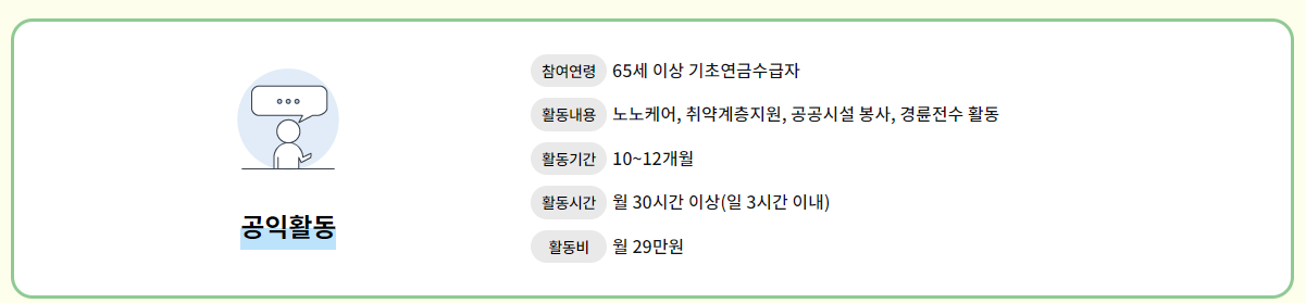 만 65세 이상이면서 기초연금 수급자를 대상으로 합니다. 노노케어, 취약계층지원, 공공시설 봉사, 학교 급식 봉사, 신호등 봉사 등의 공익적 업무를 수행하며, 월 30시간 이상, 일 3시간 이내 근무하고 월 29만 원의 급여를 받습니다.