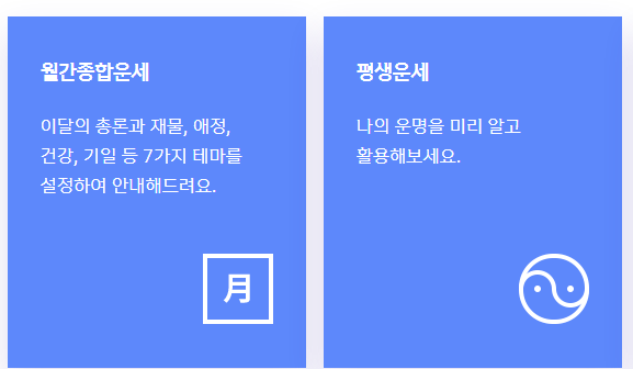 평생 운세의 경우 초년, 중년, 말년, 형제, 자식, 부부,직업 등의 6가지 주제로 운세를 확인할 수 있습니다.