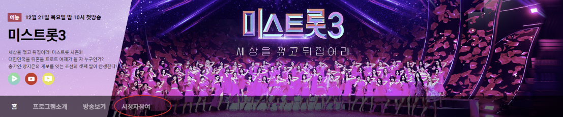 맨 위 공지사항에 보시면 미스트롯3 방청신청 모집 글이 있는데요. 여기에서 방청신청 날짜와 내용을 확인한 후 사연과 함께 신청하시면 됩니다.