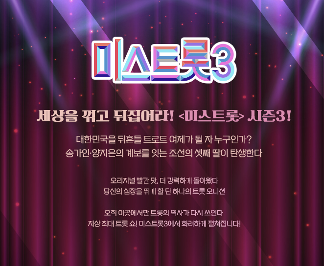 미스트롯의 세번째 시즌에서는 총 72명의 참가자들 불꽃 튀는 경쟁을 펼칠 예정인데요. 송가인, 양지은 계보를 이어갈 새로운 여제가 되기 위한 참가자들의 경연에 기대가 모아지고 있습니다.