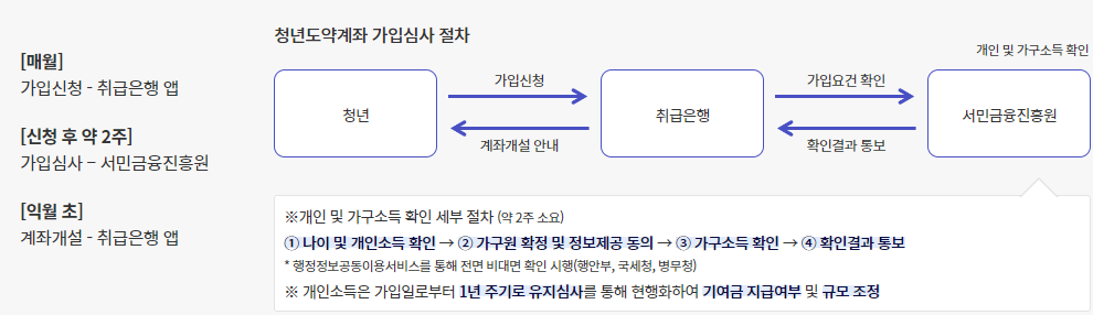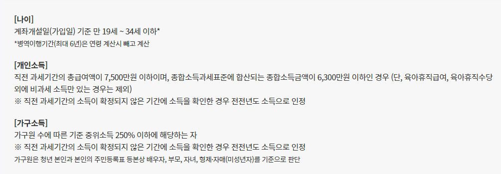 청년도약계좌 가입조건으로는 만 19세 ~ 만 34세 이하의 청년이 (병역 복무 기간 최대 6년 추가 인정) 해당되며, 개인 소득이 7,500만 원 (종합소득금액 6,300만 원) 이하이고 가구 소득 중위 250% 이하인 경우 신청이 가능합니다.