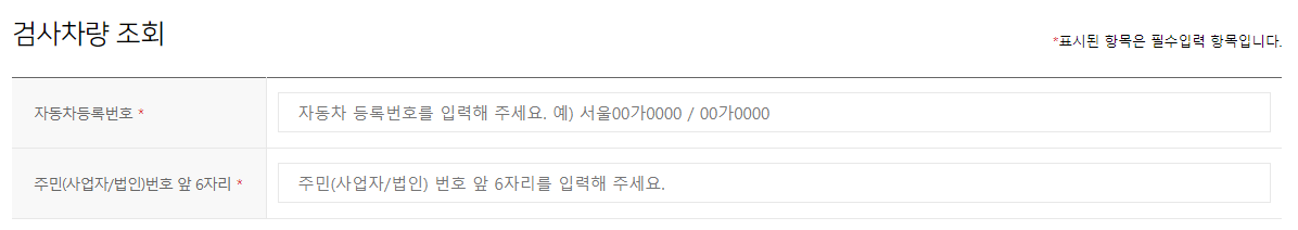 그다음으로 자동차 등록번호와 주민번호 앞 6자리를 입력한 후 차량을 조회합니다. 이렇게 하면 소유 차량의 자동차검사 기간을 확인할 수 있습니다.
