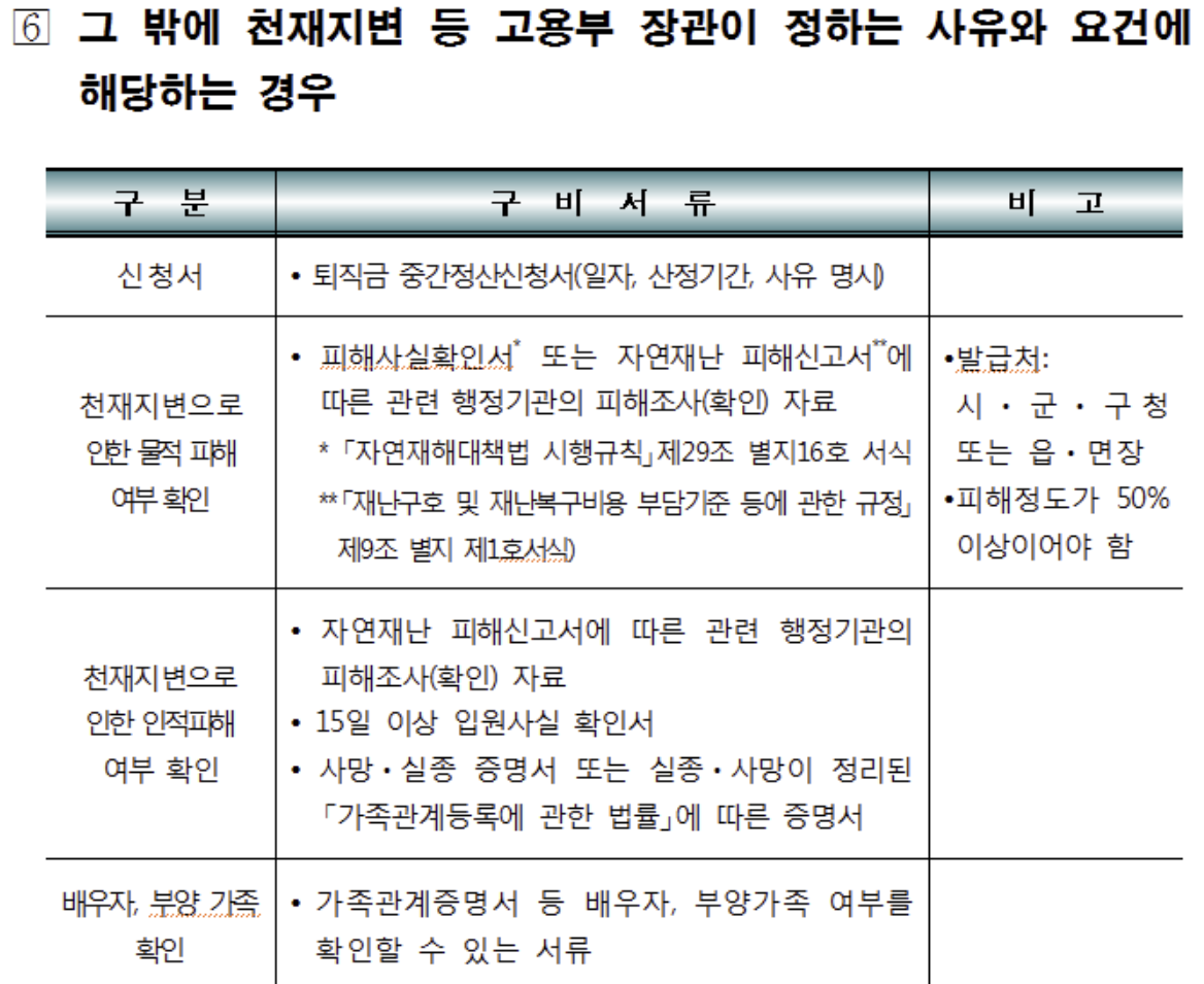 근로자 또는 부양가족이 태풍, 홍수 등 천재지변으로 인해 피해를 입은 경우 퇴직금 중간정산을 할 수 있으며 피해 사실을 증명할 수 있는 서류( 예 : 정부의 재난 피해 확인서 등)가 필요합니다.