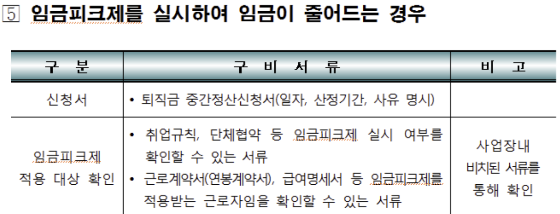 임금피크제 시행으로 인해 임금이 감소한 경우 퇴직금 중간정산이 가능하며 필요서류는 임금피크제 도입을 확인할 수 있는 취업규칙, 단체협약 등을 준비해야 합니다.