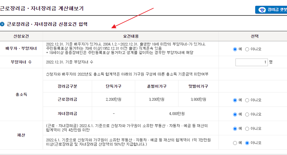 배우자 여부와 부양자녀수에서 해당하는 사항을 입력합니다. 총소득과 재산 기준을 확인하고 해당하는 사항에 체크를 합니다.