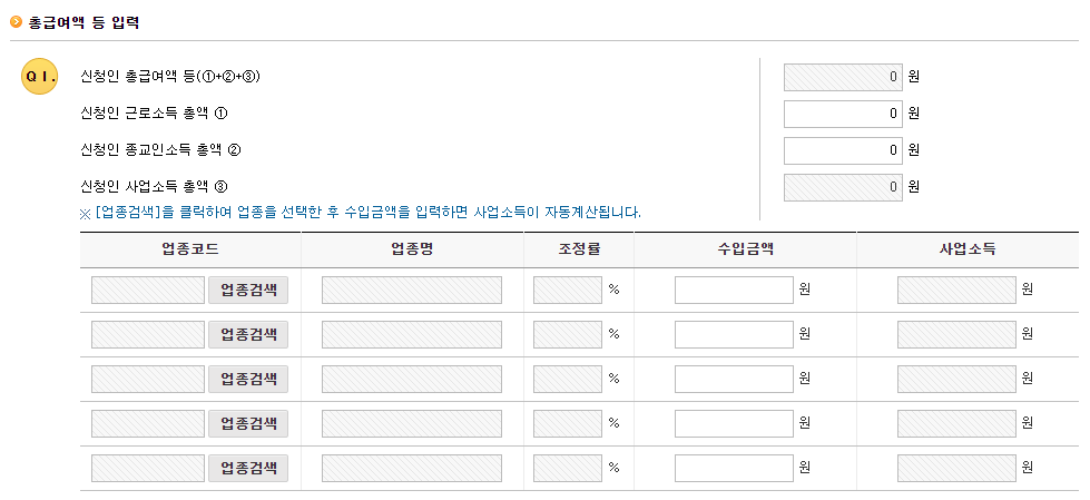 연간소득 입력할 때는 소득 종류에 따라 근로소득, 사업소득 등 연간 총 급여액 등을 입력합니다. 개인 사업자로 사업소득이 있는 경우 업종검색을 통해 업종코드를 입력하면 사업소득이 자동 계산됩니다.