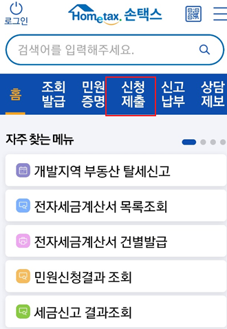 모바일앱 손택스에서도 근로장려금 지급 대상자 및 계산이 가능합니다. 메인화면 상단에 '신청 제출' 근로장려금을 선택합니다. 이후 화면에서 '안내대상자 여부 조회' 및 '계산해보기'를 하시면 됩니다.