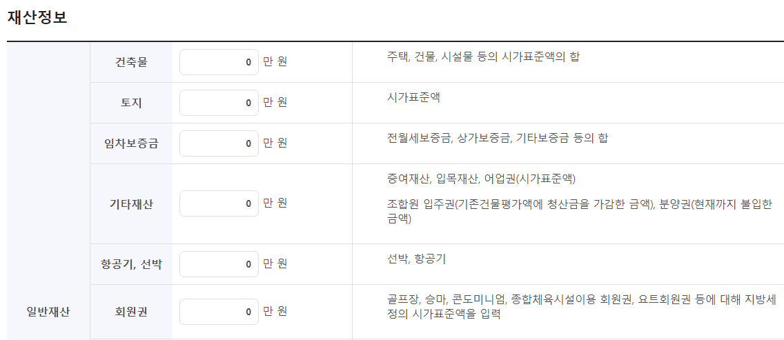 단독가구와 부부가구 중 하나를 선택하고 거주지를 선택합니다. 두 번째 입력 사항은 근로소득과 사업소득 및 재산소득, 공적이전소득, 무료임차 소득을 입력합니다. 해당이 되는 입력 사항이 있다면 입력하고 없다면 입력하지 않습니다.