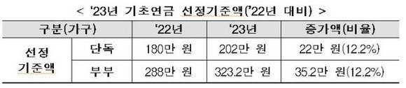 소득인정액은 물가를 반영하여 변경이 되며 2023년 기초연금 선정기준액은 단독가구 197만 원 이하, 부부가구는 315만 원 이하입니다.
