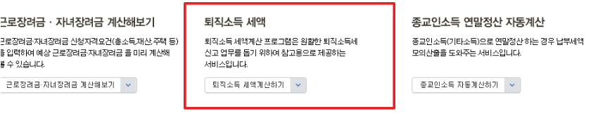 아무래도 퇴직소득세 계산방법이 굉장히 번거롭기 때문에 퇴직소득세 계산기를 이용하는 것이 좋습니다. 퇴직소득세 계산기를 홈택스에서 제공하고 있습니다.