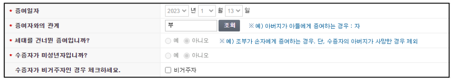 증여세 자동계산 화면에서 자동계산하기 버튼을 클릭합니다. 증여세 자동계산 입력 화면에서 증여세 기본사항을 입력하고, 이용안내에 다라 증여재산 구분 및 종류를 선택합니다.