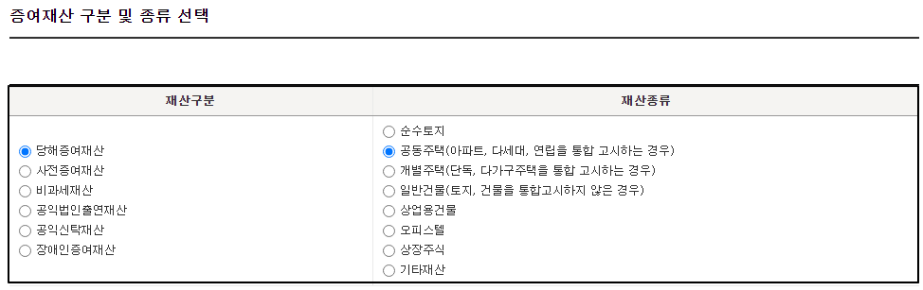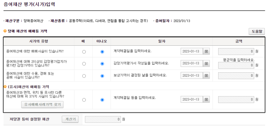 증여재산 구분 및 종류에 따른 '재산 평가액'을 입력합니다. 이후 공제사항 등을 입력하면 증여세 계산을 할 수 있습니다.