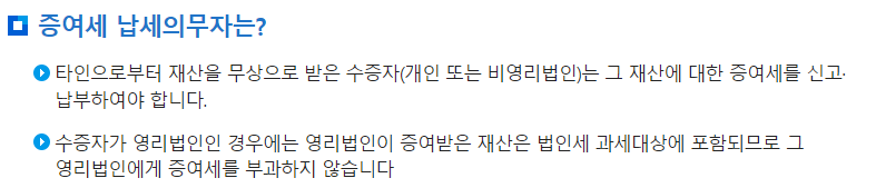 증여세는 타인의 증여에 의해 무상으로 취득한 재산을 과세대상으로 하여 그 재산을 증여받은 자가 부담하게 되는 세금을 말합니다.