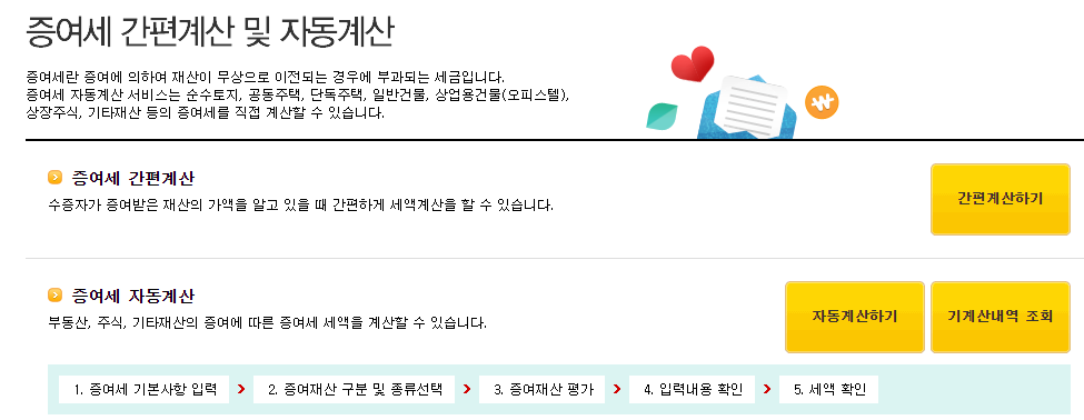 증여세 자동 계산기는 국세청 홈택스에서 제공하고 있으며 부동산, 주식, 기타 재산의 증여에 따라 증여세를 간단하게 계산할 수 있습니다.