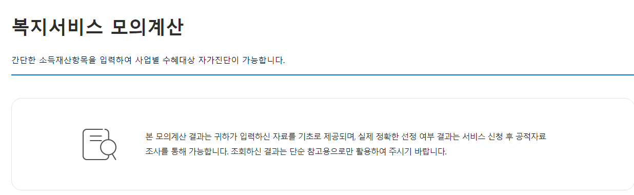 기준 중위소득 소득인정액 계산은 매우 복잡한 계산식으로 통해서 계산이 됩니다. 그래서 일반인이 계산을 하는 것은 어렵습니다. 그래서 정부에서는 차상위계층 확인을 할 수 있도록 복지로 홈페이지에서 모의계산을 제공하고 있습니다.