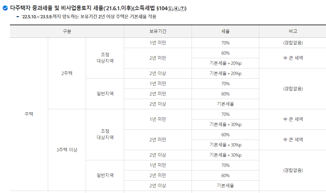 만약 2 주택자 조정대상지역 내 주택을 매도한다면 기본세율에 20% 더해서 내야 합니다. 3 주택자라면 기본세율에 30%를 더해서 양도소득세를 내야 합니다.