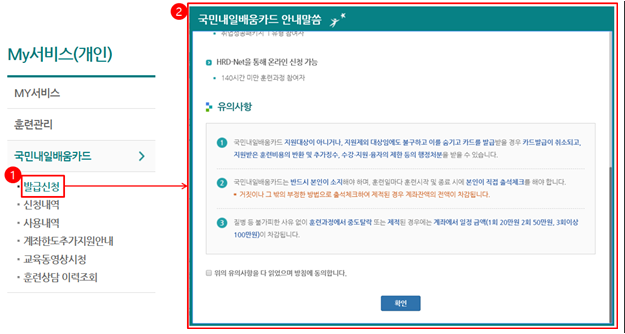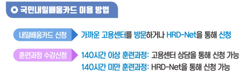 내일배움카드 신청은 직업훈련 포털인 'HER-net'에서 신청이 가능하며 가까운 고용센터에 직접 방문하여 신청도 가능합니다.