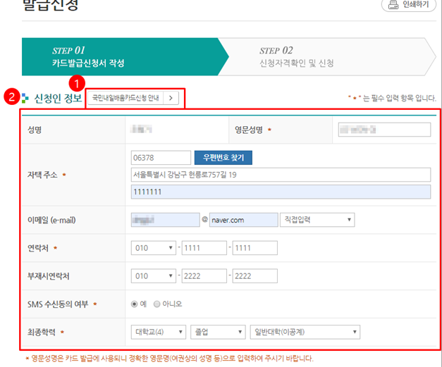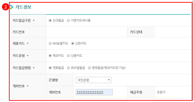 이후 홈페이지 로그인 후 메인 화면의 '발급 신청' 메뉴를 클릭한 후 해당 페이지에서 개인정보를 작성 후 카드사 및 유형, 발급방법 등을 선택하면 됩니다.
