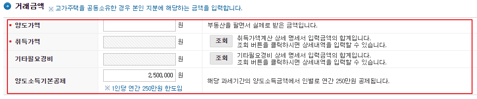 취득가액 밑에 보면 부동산 매입가액, 취득세, 등록세, 법무사비용, 중개수수료 등 기타 필요경비가 있다면 해당 사항을 입력합니다.