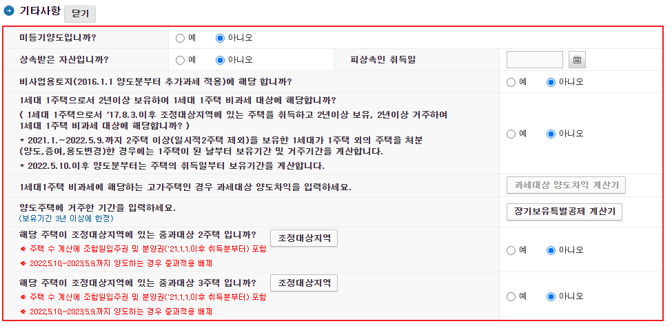 기타 사항 입력은 해당 사항이 없다면 하단에 세액계산하기를 클릭하고 장기보유를 했다면 장기보유특별공제 계산기를 클릭하고 입력합니다. 이후 계산하기를 클릭하면 양도세 자동계산이 완료됩니다.