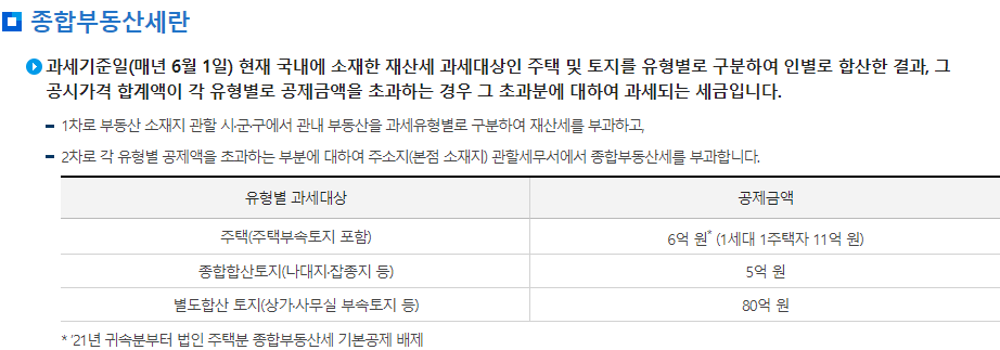 종합부동산세는 과세기준일 매년 6월 1일 현재 국내에 소재한 재산세 과세대상인 주택 및 토지를 유형별로 구분하여 인별로 합산한 결과, 그 공시 가격 합계액이 유형별로 공제금액을 초과하는 경우 그 초과분에 대하여 과세되는 세금입니다.