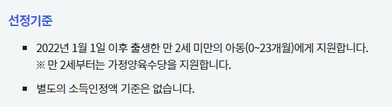 부모급여 자격조건은 만 0세, 1세 자녀가 있다면 자격조건이 됩니다. 별도로 혼동하기 쉬운 아동수당의 경우 만 0세부터 8세 미만 아동에게 지급하는 개념이기 때문에 두 가지 모두 가능합니다.
