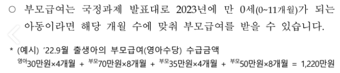 부모급여 금액은 2023년 1월 25일부터 만 0세 아동과 만 1세 아동에 각각 월 70만 원, 월 35만 원씩 부모급여가 지급됩니다.