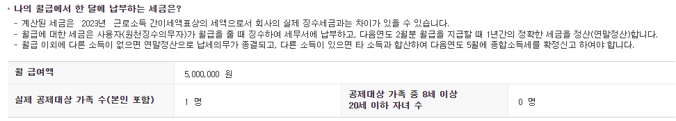 전체 공제 대상 가족 수에는 연말정산 시에 부양가족 인원이 몇 명인지 입력하면 됩니다. 부양가족이 없고 월급여가 5백만 원을 입력하고 조회를 해보겠습니다.