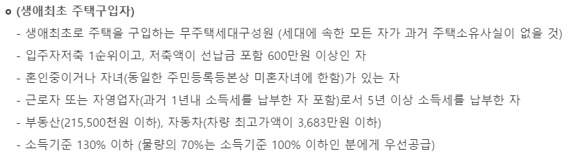 국민주택 생애최초 특별공급 조건 소득기준은 전년도 도시근로자 130% 이하이며 물량의 70%는 소득기준 100% 이하인 분에게 우선공급으로 배정이 되고 경쟁이 발생되면 추첨을 합니다.