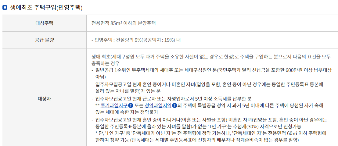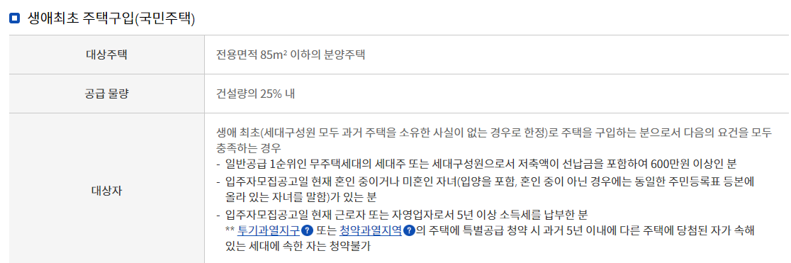 위에는 생애최초 특별공급 조건 기본 조건이며 국민주택, 민영주택에 따라 생애최초 특별공급 조건 세부 조건이 다릅니다.