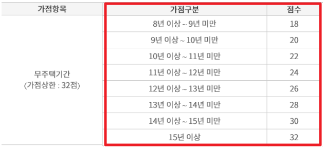 - 무주택기간 1년 미만 ~ 15년 이상 최고 32점